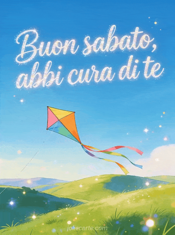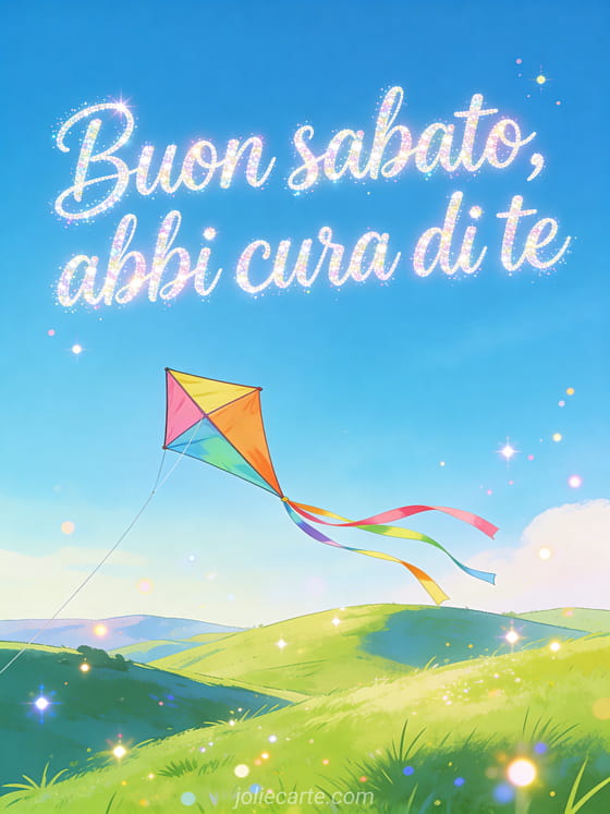 Invia un saluto caloroso di buon sabato con scritte giocose disegnate a mano, glitter delicato, cielo limpido, un aquilone a nastro che danza sopra colline verdi ondulate e particelle luminose. Puoi vedere anche questa cartolina virtuale gratuita buon sabato, questa buongiorno sabato immagine o questo il buongiorno del sabato.