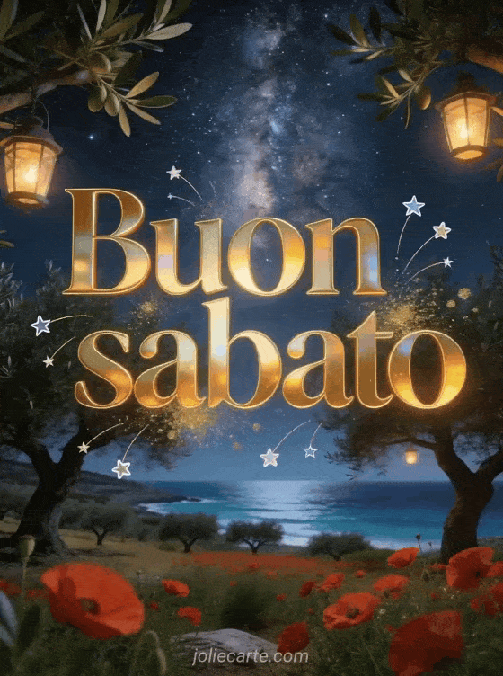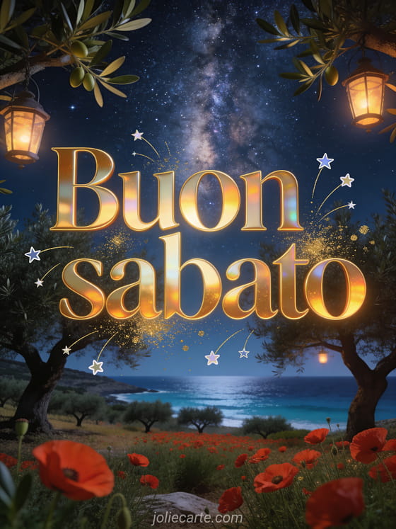 Invia un bel biglietto di buon sabato con lettere dorate, stelle cadenti, polvere dorata e un uliveto greco magico con papaveri rossi, lanterne, vista sul mar Egeo e la Via Lattea sopra gli ulivi. Scopri anche bella immagine animata buon sabato, buongiorno buon sabato buona giornata o buon sabato e buon weekend baci.