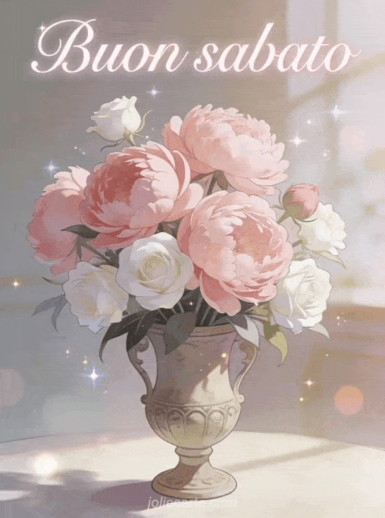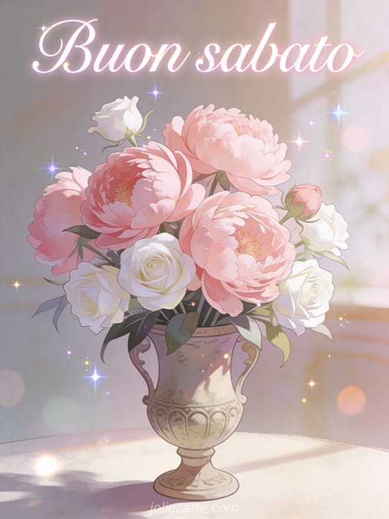Condividi un saluto raffinato di buon sabato con un bouquet di peonie rosa e rose bianche in un vaso vintage, nella morbida luce del mattino. Scopri anche un'buon sabato autunnale immagine, buon sabato soleggiato immagini o un'buon sabato amiche mie immagine.