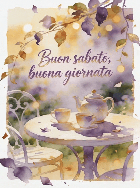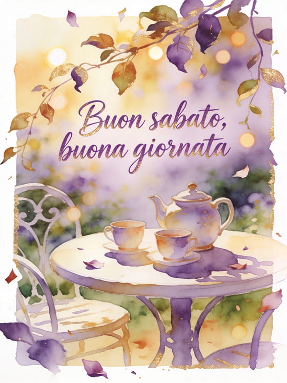 Invia un saluto amichevole di sabato con una teiera di ceramica, due tazze dipinte e un tavolo rotondo da giardino nella luce calda. Scopri anche buon sabato romantico immagine, buon sabato buon weekend immagini o sabato buongiorno gif.