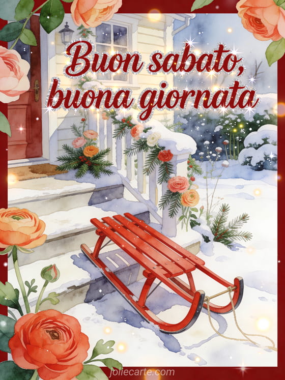 Invia buon sabato neve gif con calligrafia rosso intenso, una slitta rossa accanto a un gradino innevato di cottage, petali di ranuncolo e rametti sempreverdi oltre il bordo. Potrebbero piacerti anche questa sabato buona giornata gif, queste buon sabato baci immagini o queste buon sabato immagini invernali.