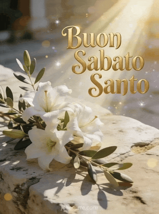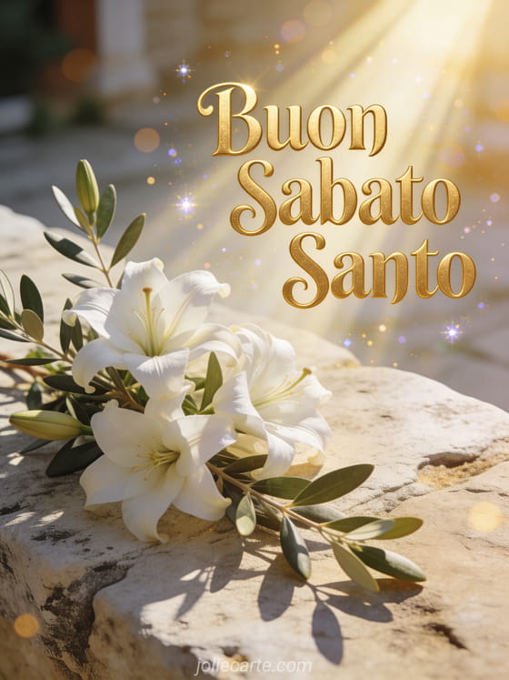 Condividi buon sabato santo con rami d'ulivo e gigli bianchi su una superficie di pietra, illuminati da luce dorata divina e da una dolce pace. Continua il weekend con immagine gratis buon sabato, buon sabato immagini meravigliose o buon sabato sera gif.