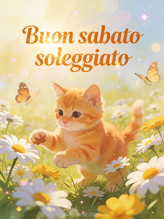 Condividi un saluto luminoso di buon sabato soleggiato con un adorabile gattino rosso che gioca in un campo di margherite mentre volano farfalle. Scopri anche un'buon sabato amiche mie immagine, un'immagine animata buon sabato o un buon sabato a tutti gif.
