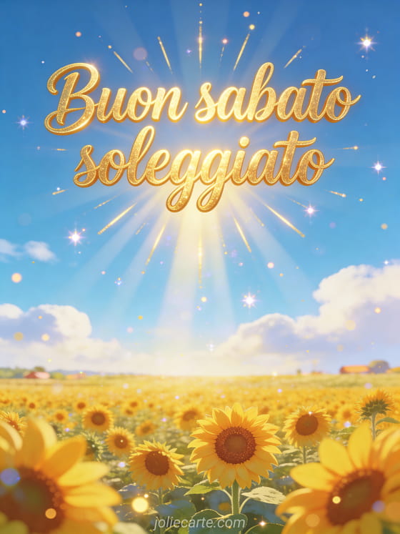 Condividi un saluto incoraggiante di buon sabato soleggiato con un vasto campo di girasoli che si estende fino all'orizzonte sotto un cielo azzurro brillante. Scopri anche buon sabato buon weekend immagini, felice sabato e buon weekend o un'buon sabato immagine.