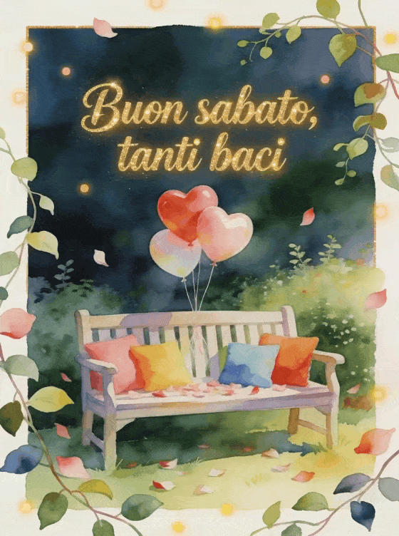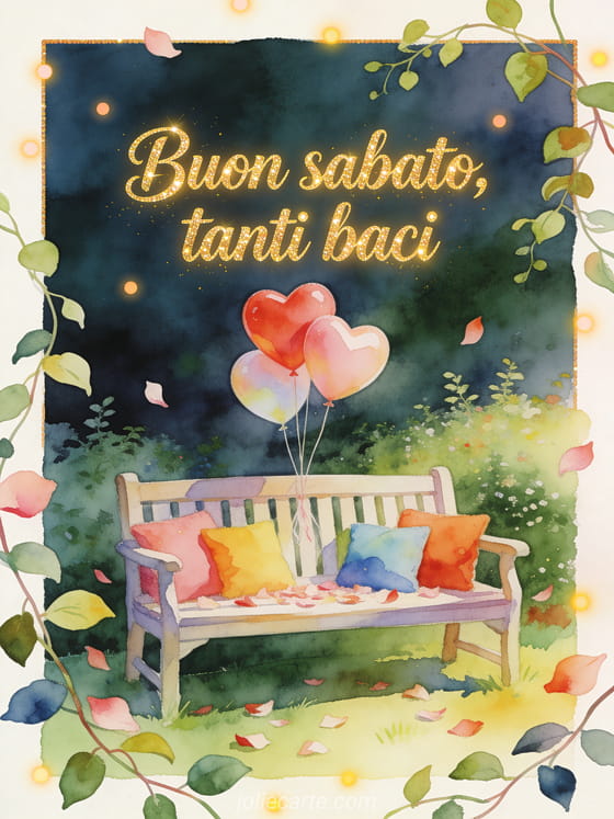 Condividi buon sabato e tanti baci con un biglietto ad acquerello che mostra una panchina da giardino con cuscini colorati, palloncini a cuore, petali e tralci verdi. Scopri anche un biglietto di immagine gratis buongiorno sabato, belle immagini di buon sabato o buon sabato e buon weekend gif animata.