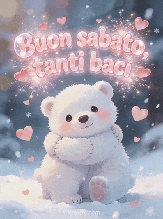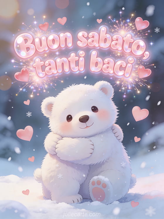 Invia buon sabato tanti baci con lettere rosa tonde, cuori fluttuanti, neve leggera e un adorabile cucciolo di orso polare che dà un caldo abbraccio. Scopri anche una bella immagine di buon sabato o una buon sabato buon weekend baci.