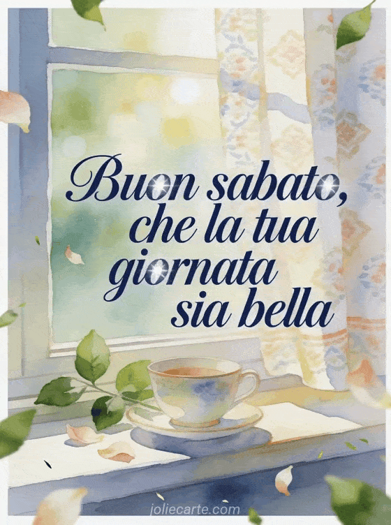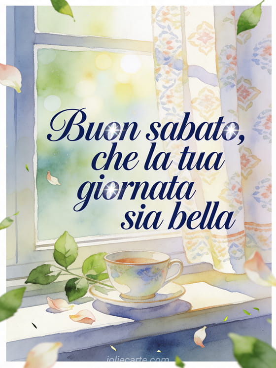 Condividi un testo di buon sabato con elegante calligrafia blu navy, una tazza di porcellana sul davanzale, foglie verdi fresche, petali sparsi e luce del mattino attraverso le tende decorate. Puoi inviare anche immagine buon sabato amici, buongiorno buon sabato immagine o buon sabato gif animata.