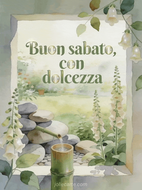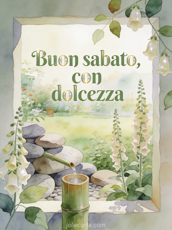 Condividi un angolo sereno di giardino ad acquerello con pietre lisce di fiume, una fontana di bambù, alti fiori di digitale e delicata luce dorata. Scopri anche buon sabato testo, immagine buon sabato amici o buongiorno buon sabato immagine.