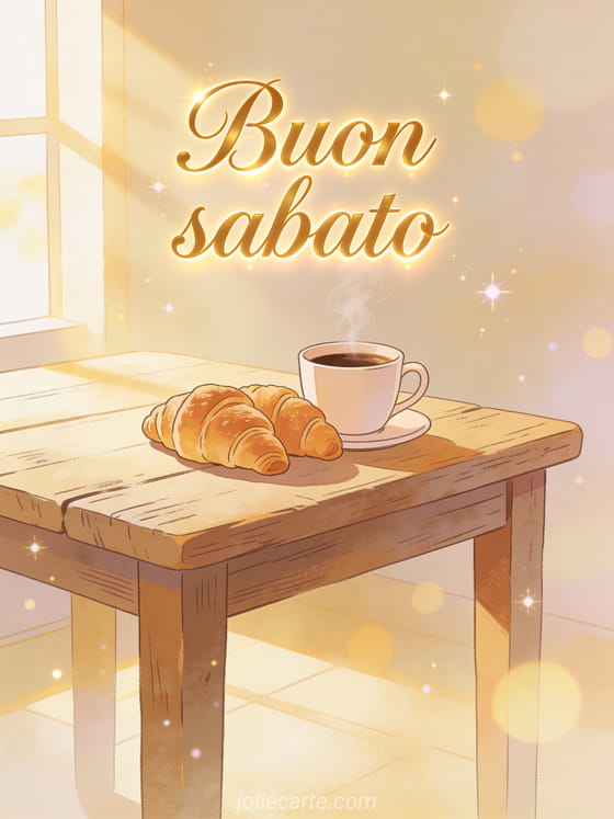 Augura a qualcuno un meraviglioso sabato con questa calda cartolina con caffè fumante e croissant freschi nella luce dorata del mattino. Scopri anche buon sabato cuore o buongiorno buon sabato gif.