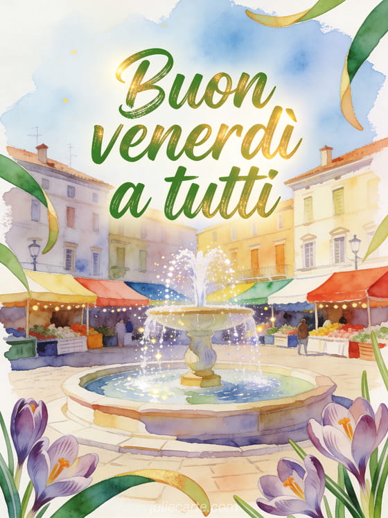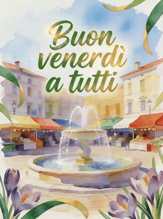 Invia buon venerdì a tutti immagine con lettere verdi accoglienti, crocus oltre il bordo, una fontana luminosa nella piazza del villaggio, tende colorate del mercato e acqua scintillante. Potrebbero piacerti anche queste buon venerdì foto animate, questa buon venerdì gif animata o questa buon venerdì soleggiato immagine.
