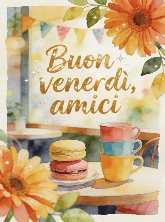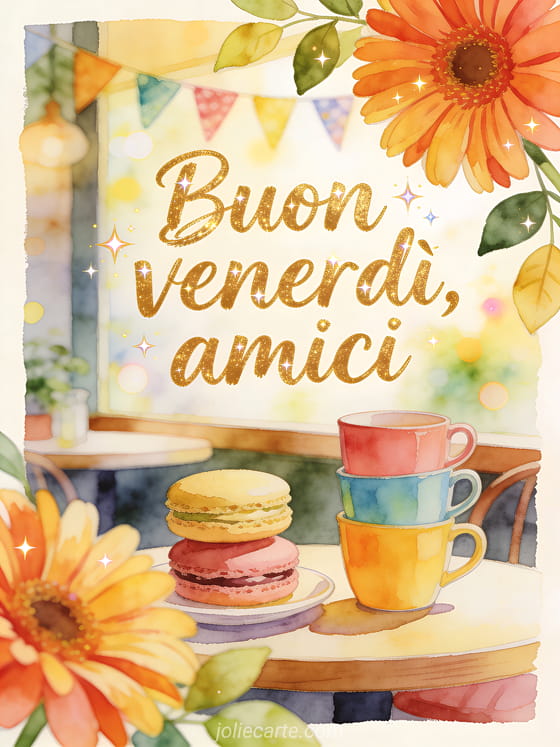 Condividi un angolo di caffè assolato ad acquerello con macaron impilati, tazze colorate, festoni e petali di gerbera oltre il bordo. Continua a celebrare il venerdì con buon venerdì gif, immagine scintillante buon venerdì o buon venerdì citazione positiva immagine.