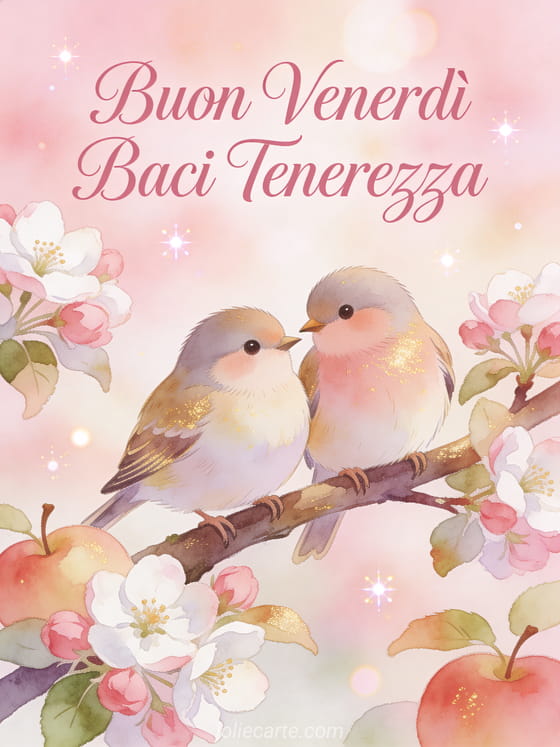 Condividi un tenero saluto di buon venerdì con uccellini innamorati su un melo in fiore in primavera. Scopri anche una cartolina buon venerdì natura o una cartolina buon venerdì immagine.