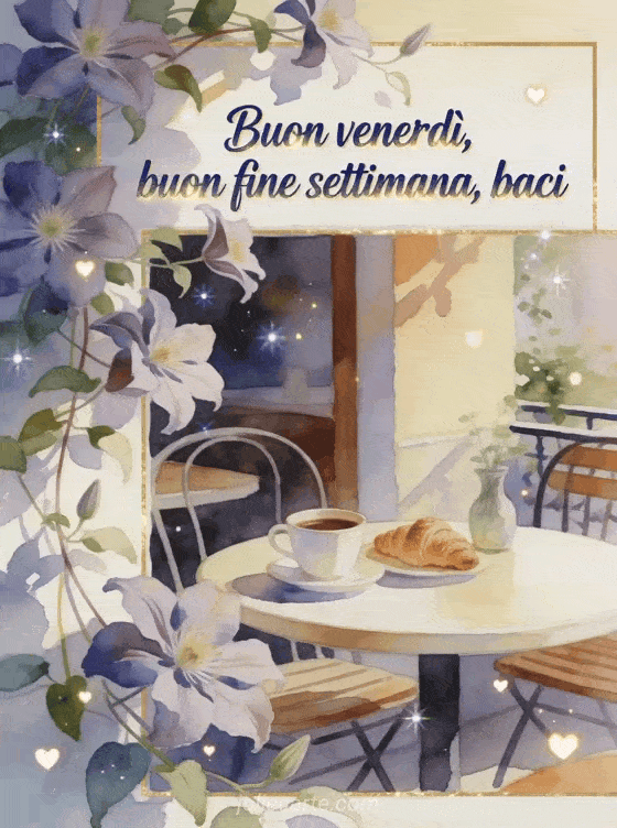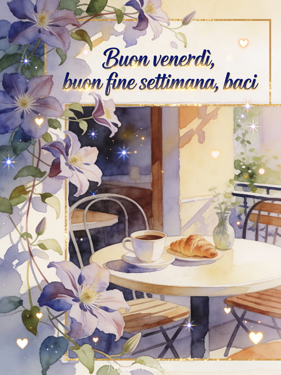 Condividi un saluto caloroso di venerdì e fine settimana con fiori di clematide, un tavolino da caffè all'aperto, una tazza di caffè, croissant e un piccolo vaso in acquerello. Scopri anche immagini gratis buon weekend baci, buon fine settimana baci gif o passa un buon weekend baci.