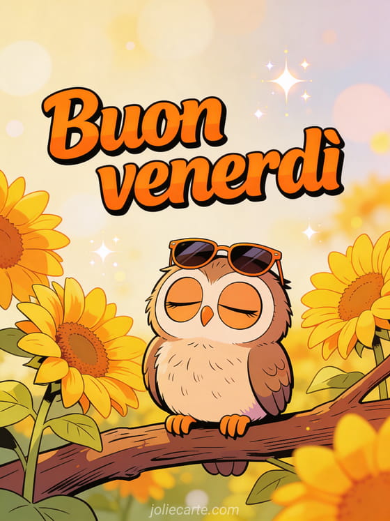 Condividi un saluto allegro di buon venerdì con scritta cartoon arancione, un piccolo gufo divertente dagli occhi grandi, piccoli occhiali da weekend e girasoli gialli in fiore. Scopri anche un messaggio per augurare buon venerdì ai musulmani, un biglietto di buon venerdì con gattino o immagini buongiorno venerdì.