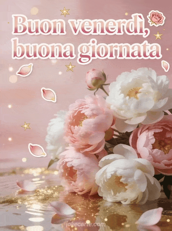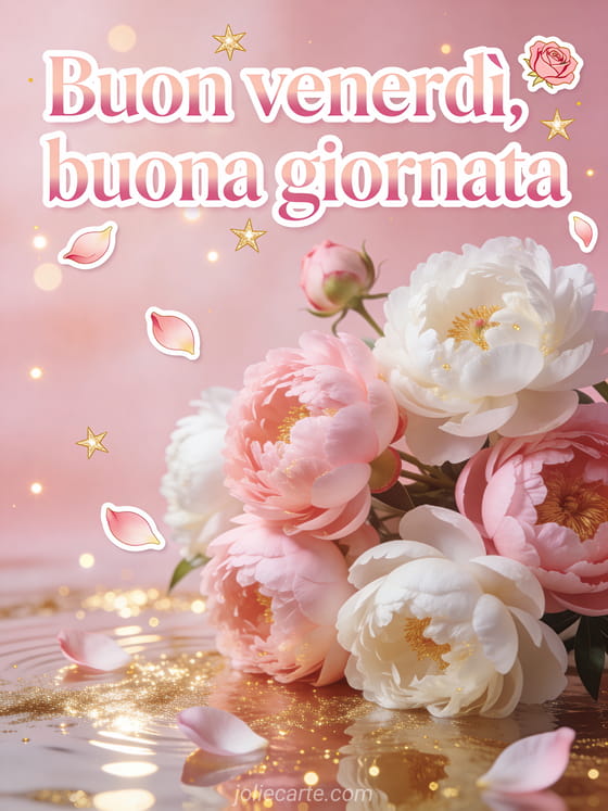 Condividi un messaggio delicato di buon venerdì con peonie, petali di rosa, stelle dorate e un augurio caloroso per una bella giornata. Scopri anche una bella immagine di buon venerdì, un buon venerdì sole gif o una immagine di buon venerdì con fiori.