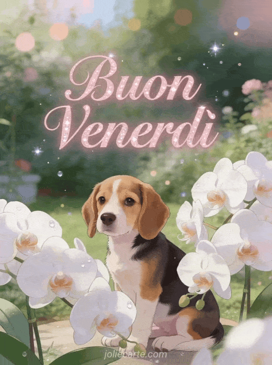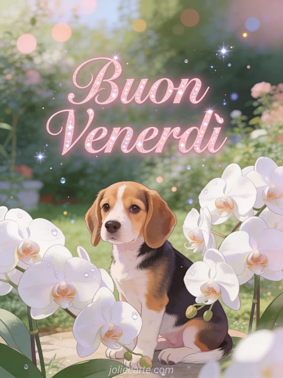 Buon venerdì buongiorno un saluto mattutino tranquillo ed elegante di venerdì con un adorabile cucciolo di Beagle tra orchidee bianche