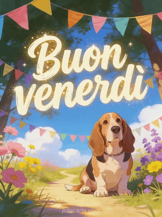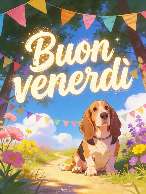 Condividi buon venerdì con scritte cremose, un cane basset hound su un sentiero soleggiato nel prato, bandierine colorate e fiori di campo. Puoi inviare anche coraggio è venerdì, una buon venerdì e buon weekend immagine o buongiorno venerdì umorismo gif.