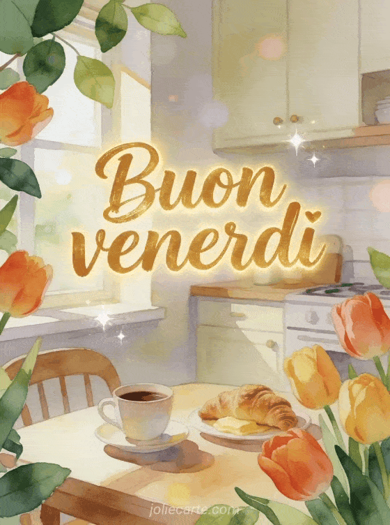 Invia un saluto gioioso di buon venerdì con tulipani luminosi, foglie fresche, una tazza di caffè e croissant al burro su un tavolo accogliente in una cucina soleggiata. Scopri anche testo per augurare un buon venerdì, una buon venerdì farfalla immagine o buon venerdì immagini animate.