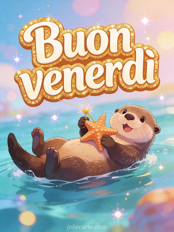 Condividi un saluto divertente di buon venerdì con lettere cartoon stravaganti, contorno dorato scintillante e una lontra spassosa che galleggia sulla schiena tenendo una stella marina come un premio. Scopri anche gif animate di buon venerdì con baci, una frase buongiorno venerdì o un messaggio per augurare buon venerdì.