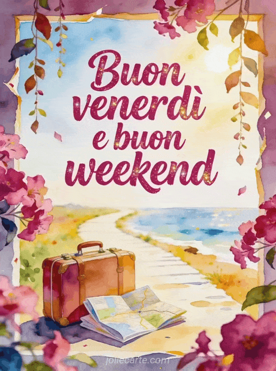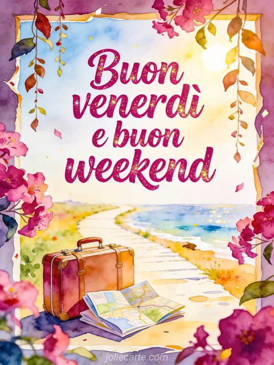 Condividi auguri di buon venerdì e buon weekend con una scena allegra ad acquerello di fiori di fucsia, una piccola valigia da viaggio, una carta stradale piegata e un sentiero luminoso verso il mare. Puoi inviare anche un buon venerdì sotto la pioggia gif, baci del venerdì immagini o una buonissimo venerdì immagine.