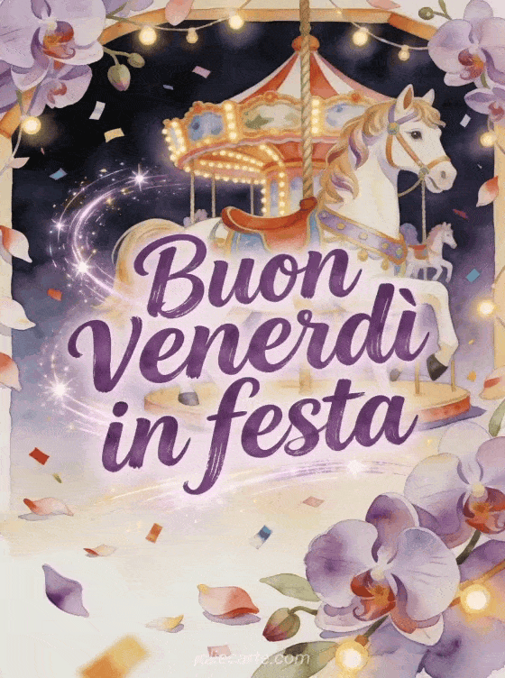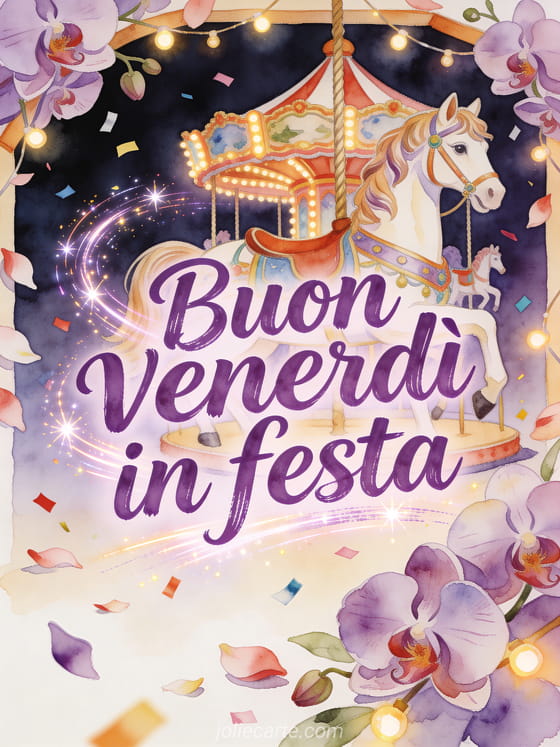 Condividi un buon venerdì in festa con una scena vivace ad acquerello, dove fiori di orchidea avvolgono un cavallo da giostra fantasioso, vortici di coriandoli e luci brillanti. Puoi inviare anche una buon venerdì gif animata, una buon venerdì soleggiato immagine o una buon venerdì immagine molto bella.