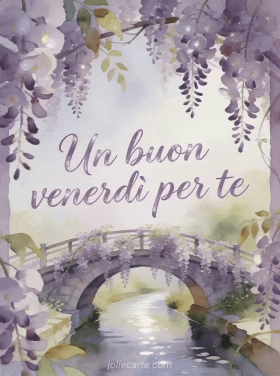 Condividi un buon venerdì sereno con scritta lavanda elegante e bagliore perlato. Questa cartolina gratuita mostra un ponte ad arco sopra un fiume stretto coperto di glicine pendente, con fiori a cascata e riflessi luminosi. Scopri anche buon venerdì e buon weekend immagini, un buongiorno venerdì gif o un testo di buon venerdì.