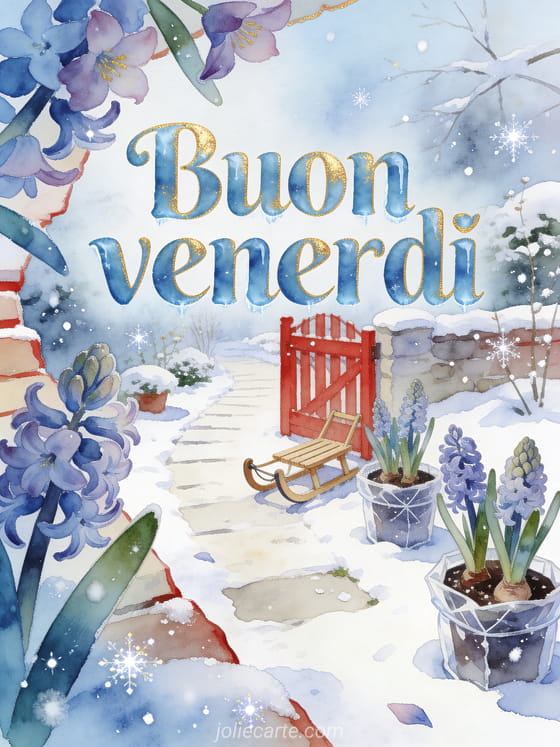 Condividi un buon venerdì con una scena innevata e accogliente ad acquerello, dove giacinti in vasi protetti costeggiano un sentiero di giardino accanto a una piccola slitta di legno e a un cancello rosso. Puoi inviare anche un buon venerdì e buon weekend gif, un buon venerdì sotto la pioggia gif o baci del venerdì immagini.