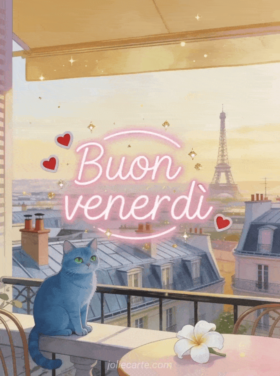 Invia un biglietto romantico di buon venerdì con lettere neon rosa tenue, cuori rossi, glitter dorato e una terrazza parigina su un tetto con vista sui tetti di zinco e sui comignoli, un gatto blu di Russia dagli occhi verdi, un fiore di tiaré bianco e la Torre Eiffel nella luce della golden hour. Scopri anche buona giornata di venerdì baci, buongiorno venerdì immagine o buon venerdì mattina caffè.