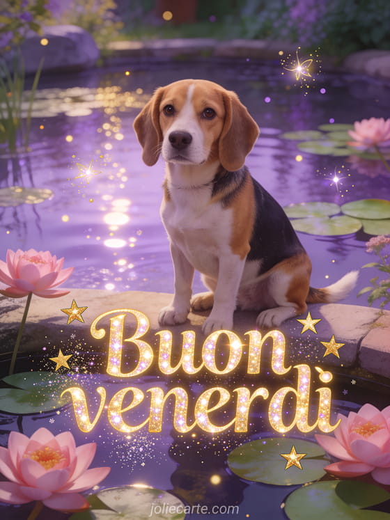 Invia un buon venerdì scintillante con lettere dorate, fiori di loto, ninfee e un dolce beagle accanto a uno stagno incantato al crepuscolo. Scopri anche un buongiorno eccellente giornata di venerdì, un buon venerdì buona giornata immagini o una bella immagine di buon venerdì.