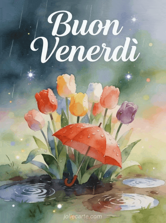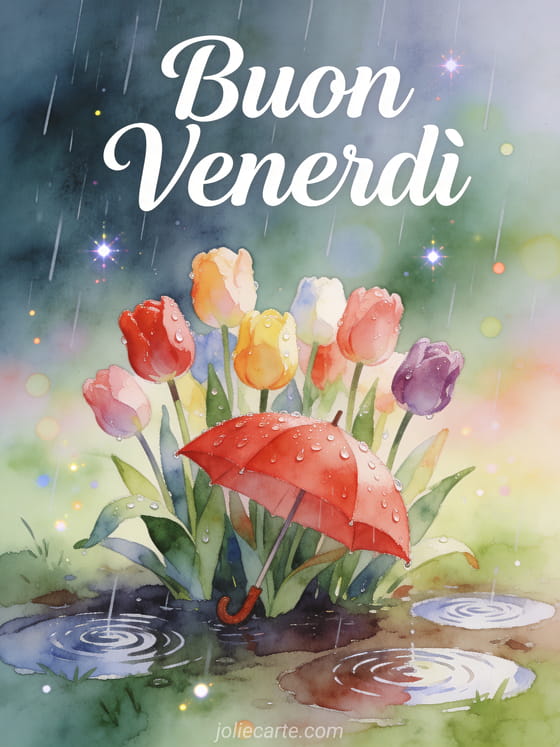 Condividi un delicato e fresco saluto piovoso di venerdì con tulipani brillanti e un ombrello rosso. Scopri anche una messaggio buon venerdì o una buon venerdì buongiorno cartolina.