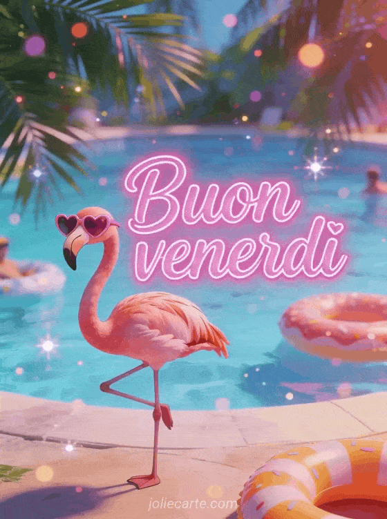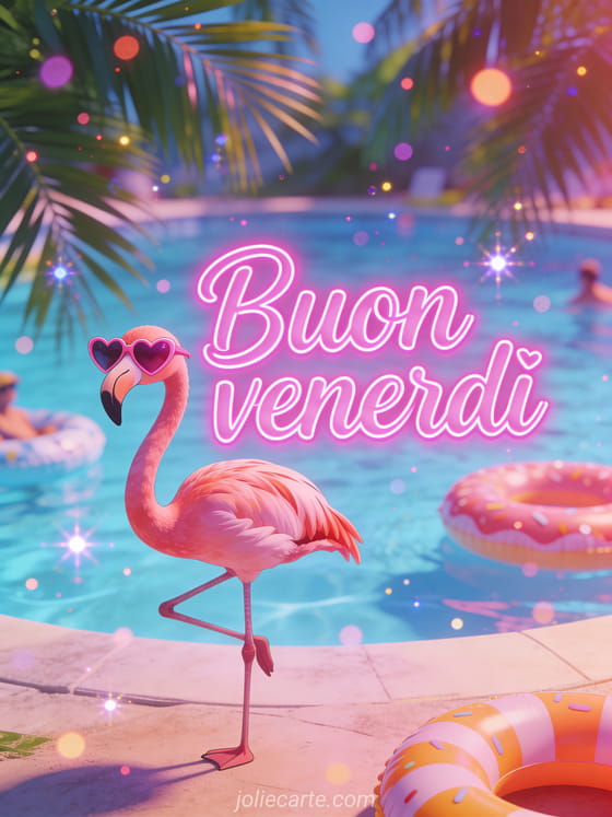 Condividi un saluto allegro di buon venerdì con lettere comiche magenta, un fenicottero buffo su una zampa e occhiali a forma di cuore in atmosfera da festa tropicale in piscina. Scopri anche un biglietto di buonissimo venerdì, un biglietto buongiorno venerdì con baci o una immagine gatto di buon venerdì.