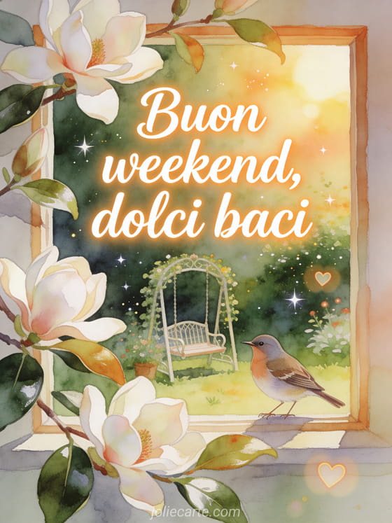 Condividi un buon weekend con dolci baci attraverso una scena morbida di giardino ad acquerello, magnolie, foglie lucide, un usignolo e una piccola altalena. Puoi inviare anche una buon weekend baci foto, ciao buon weekend baci o buon weekend a tutti baci.