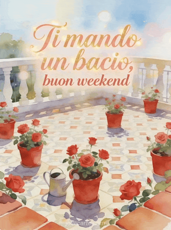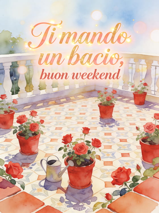 Invia una cartolina serena per il weekend con scritte ad acquerello, vasi di rose rosse, una terrazza soleggiata con piastrelle e un piccolo annaffiatoio. Scopri anche una bacioni buon weekend gif, una buon weekend baci gif o una buon weekend a tutti baci.