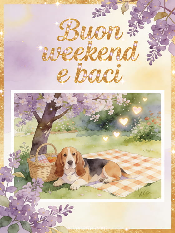 Condividi un biglietto soleggiato per il weekend con scritta dorata, rami di lillà oltre il bordo, un cane basset hound accanto a un cestino da picnic sotto un albero fiorito del giardino. Puoi inviare anche baci per il weekend, buon weekend animato baci o buon fine settimana a tutti umorismo.