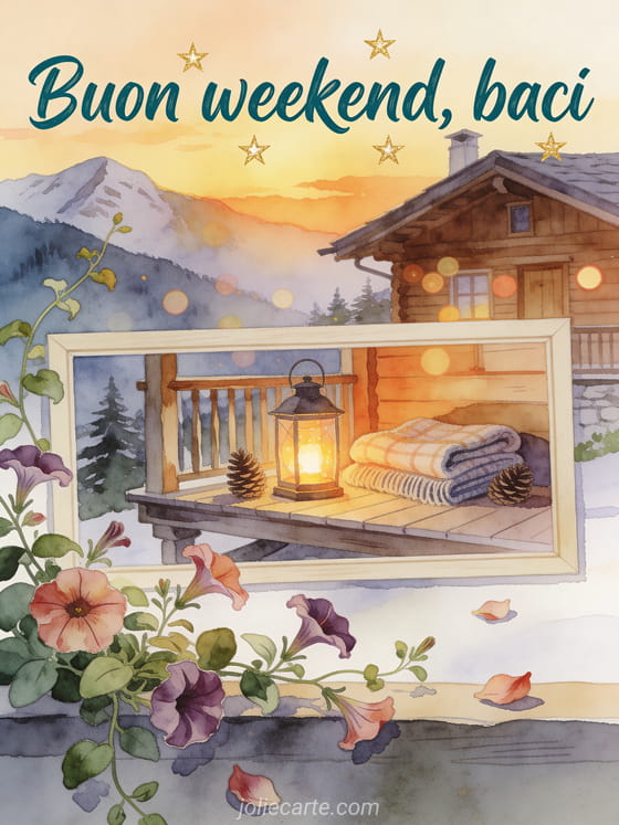Condividi buon weekend con baci attraverso un biglietto ad acquerello con portico di chalet in montagna, lanterna accesa, coperta piegata, pigne e petunie ricadenti. Scopri anche un biglietto di buon fine settimana baci gif immagine, buon weekend e baci o buon weekend tanti baci.