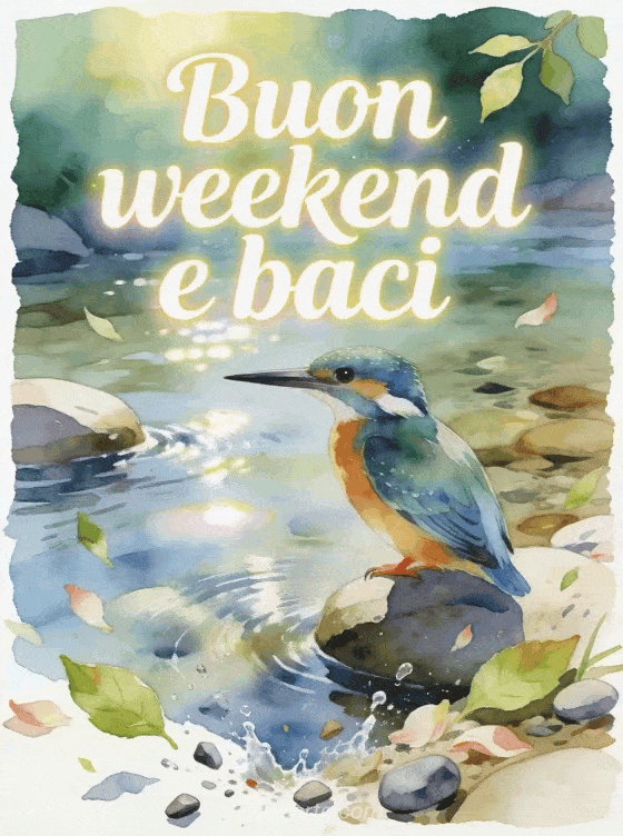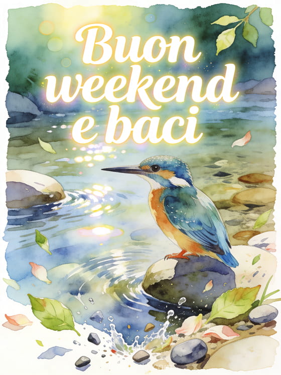 Condividi un augurio luminoso per il weekend con scritte ad acquerello, un martin pescatore vicino a un fiume limpido, pietre levigate e foglie fresche. Scopri anche un biglietto baci per il weekend, un biglietto buon weekend baci immagine o un biglietto buon weekend baci animati.