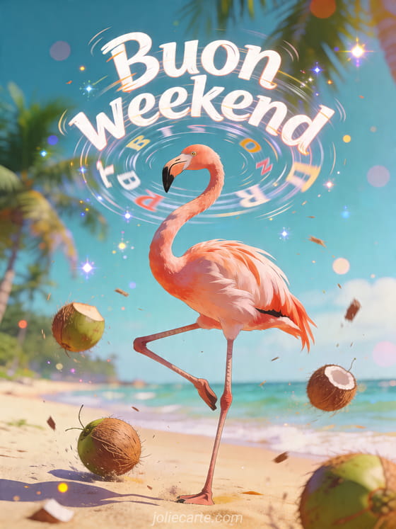 Fai sorridere qualcuno con questo biglietto del weekend che mostra un fenicottero maldestro in posa di balletto su una gamba sola su una spiaggia tropicale caotica con noci di cocco che rotolano. Scopri anche vi auguro un buon weekend, buon fine settimana a tutti o buon weekend divertente.