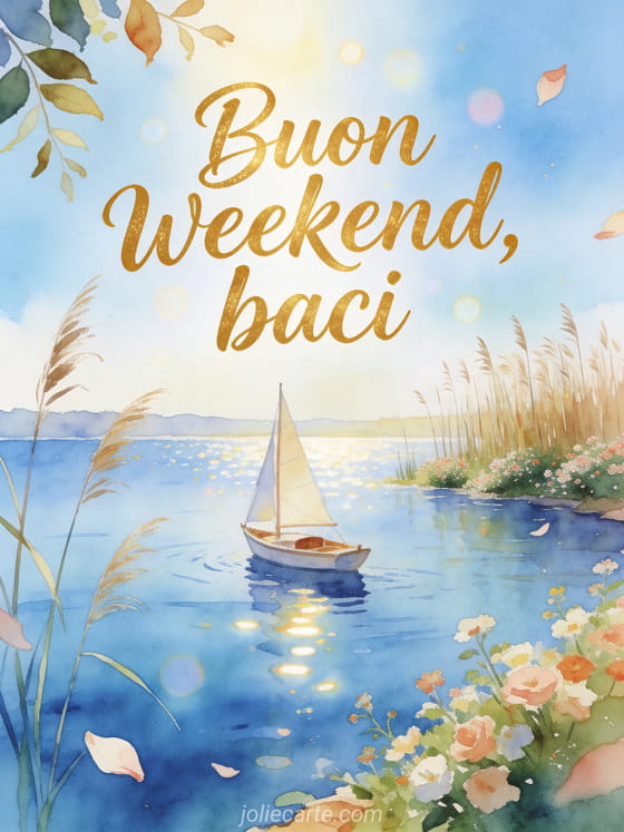 Invia una cartolina rilassante per il weekend con scritte leggere ad acquerello, una piccola barca a vela su un lago blu brillante, canne e rive con fiori selvatici per una pausa serena. Scopri anche una bacio grande buon weekend baci, una gif buon weekend bacioni o una buon weekend farfalla baci.