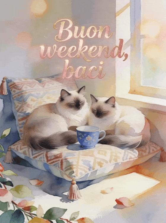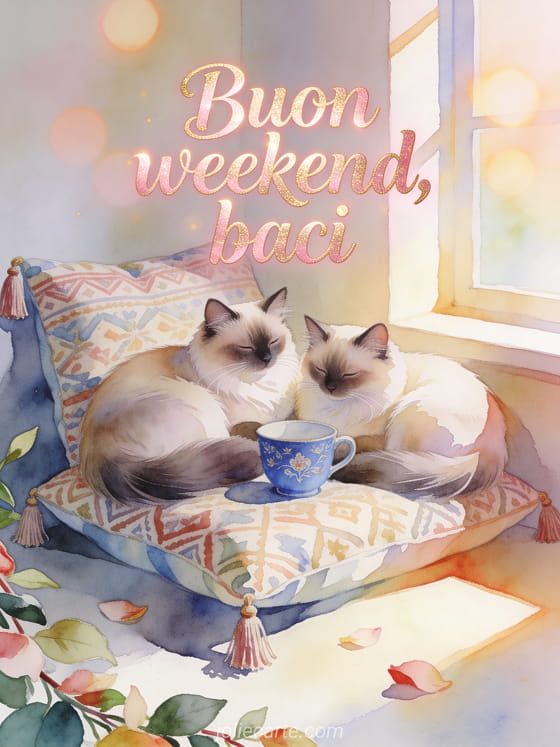 Invia un saluto accogliente di buon weekend con due gatti birmani, una tazza blu e il fascino caldo dell'acquerello. Scopri anche una immagini buon weekend bacioni, una buon fine settimana primavera o una gif bacioni buon weekend.