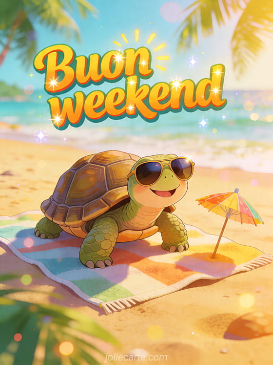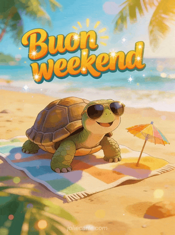 Condividi questo divertente biglietto di buon weekend con una tartaruga felice con occhiali, telo da spiaggia e atmosfera da cocktail. Puoi anche scoprire umorismo buon weekend gif, augurare buon weekend con umorismo e gif animato buon weekend.