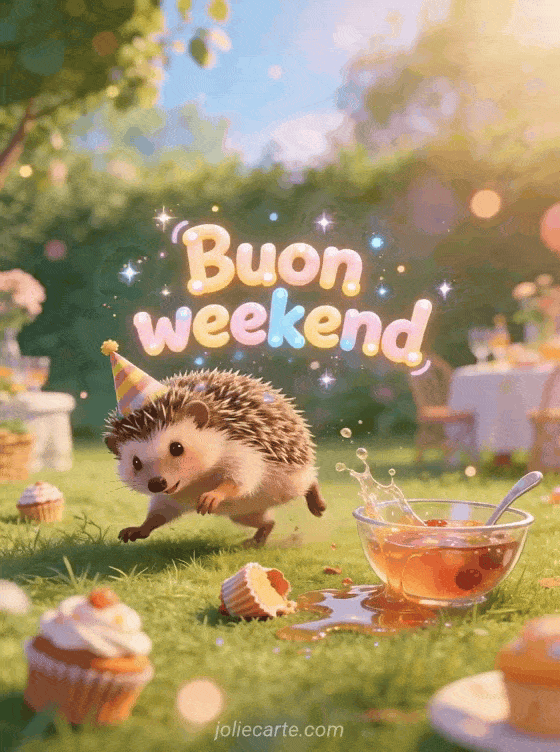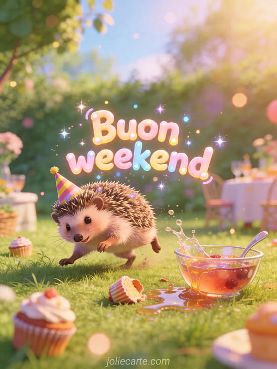 Condividi questo divertente biglietto di buon weekend con un riccio traballante, cupcake e una festa in giardino tutta in disordine. Puoi anche scoprire buon fine settimana, foto umorismo buon weekend e buon weekend soleggiato umorismo.