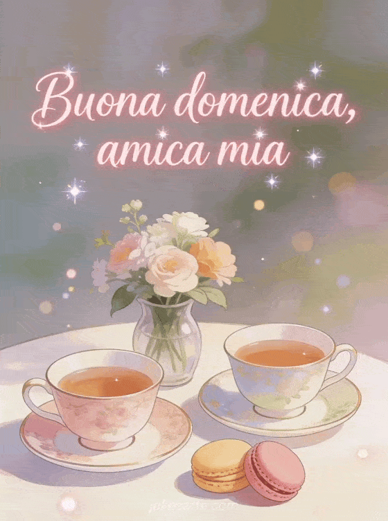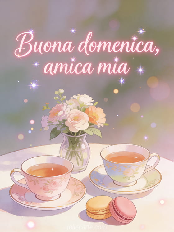 Condividi buona domenica amica mia con scritte rosa calde, un elegante tè del pomeriggio per due, belle tazze, macaron, fiori freschi e una dolce atmosfera di amicizia. Scopri anche buona domenica gif divertente o bella cartolina virtuale buona domenica.