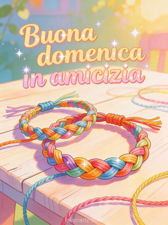 Invia un saluto caloroso di buona domenica in amicizia con lettere pastello, accenti scintillanti, braccialetti intrecciati su un tavolo di legno chiaro, fili colorati, toni solari e un'atmosfera amichevole. Puoi vedere anche questa buongiorno ciao buona domenica, questo buona domenica gatto umorismo o questo buona domenica caffè gif.