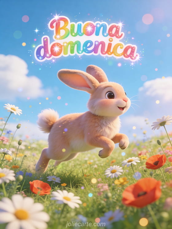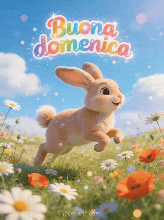 Condividi una cartolina animata di buona domenica con scritte arcobaleno, un coniglio carino che salta tra fiori selvatici, margherite e papaveri sotto un cielo azzurro con nuvole soffici. Scopri anche gif animati coccinella buona domenica o buona domenica umoristica umorismo animali.