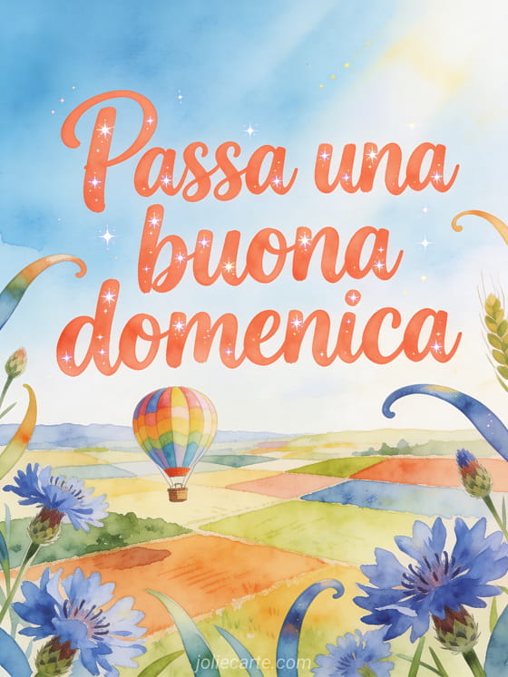 Condividi un saluto radioso di buona domenica con una mongolfiera sopra campi variopinti, fiordalisi e un cielo azzurro morbido. Scopri anche belle cartoline buona domenica, immagine per augurare buona domenica o gif scintillanti buona domenica.
