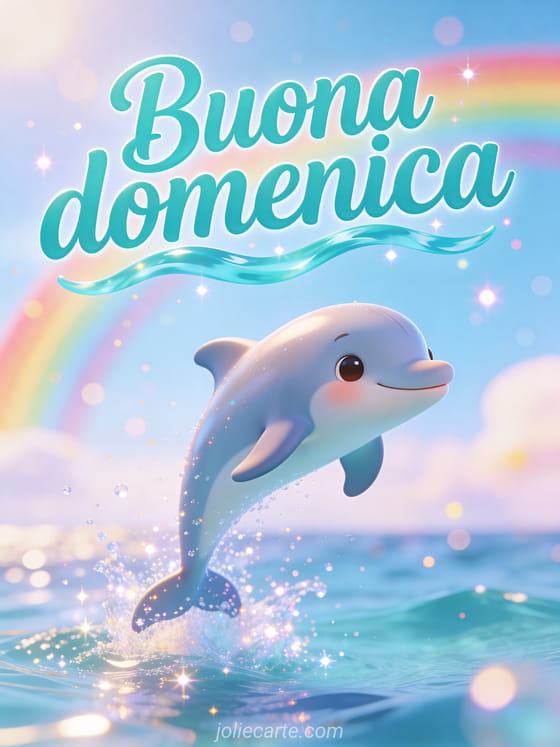 Condividi un saluto giocoso di domenica con un delfino cartoon adorabile che salta dall'acqua scintillante dell'oceano, un arcobaleno ed energia estiva. Puoi anche inviare buona domenica mattina o buona domenica amore mio.