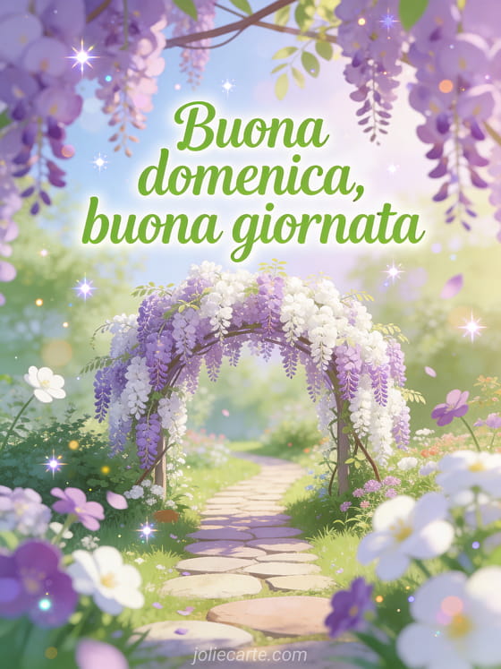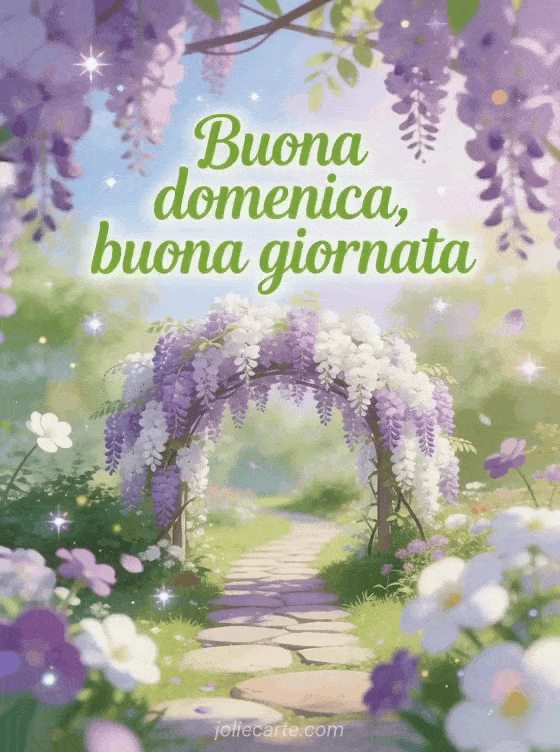 Condividi un bel saluto di domenica con un giardino di primavera, un arco di glicine in fiore, sentiero di pietra, fiori viola e bianchi, e un'atmosfera incantevole. Puoi anche inviare spiritoso buona domenica gif o buona domenica sera.