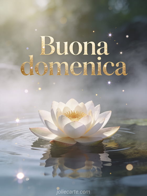Condividi una citazione di buona domenica con scritte ispiratrici, un sottile bagliore dorato, un bellissimo fiore di loto che galleggia su acqua tranquilla, nebbia del mattino e atmosfera spirituale da giardino zen. Scopri anche buona domenica amicizia gif o buona domenica immagini gif animata.