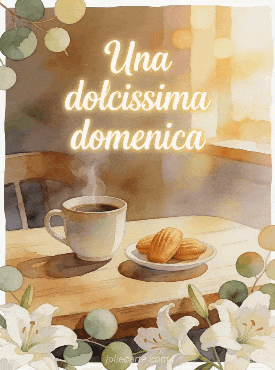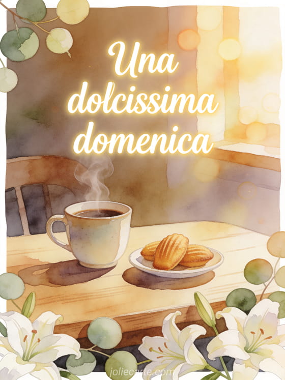 Condividi una dolce cartolina di buona domenica con una tazza di caffè fumante, madeleine e gigli su un tavolo di legno. Scopri anche buona domenica gatto gif, buona domenica biglietto gratuito o immagini di buona domenica.