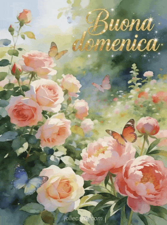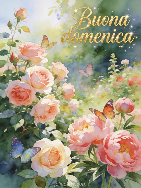 Condividi un saluto delicato di domenica con un giardino rigoglioso di inizio estate, rose e peonie in piena fioritura, farfalle colorate e luce soffusa ad acquerello. Puoi anche inviare buona domenica amicizia immagini o buongiorno ciao buona domenica.